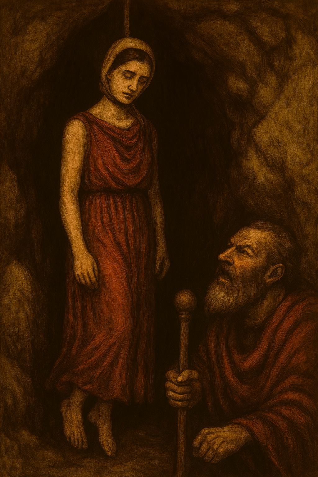 When he gets to the cave, he finds that Antigone has taken her own life.