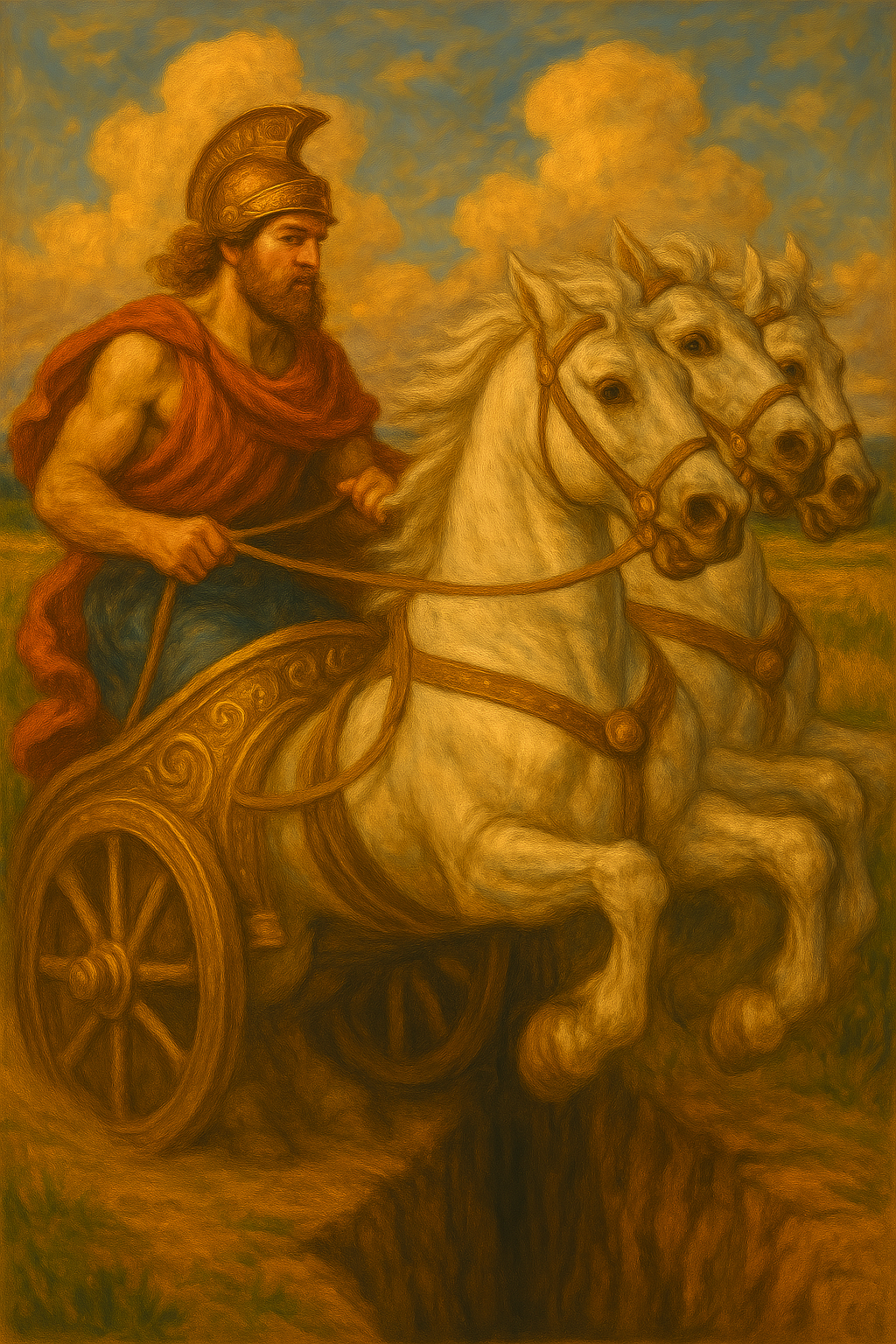 One day she was playing with her friends on a flowery meadow. All of a sudden the ground split into two. Hades, the god of the underworld, came up to the ground through a chasm on his chariot. He abducted her. He took her to the dark underworld.